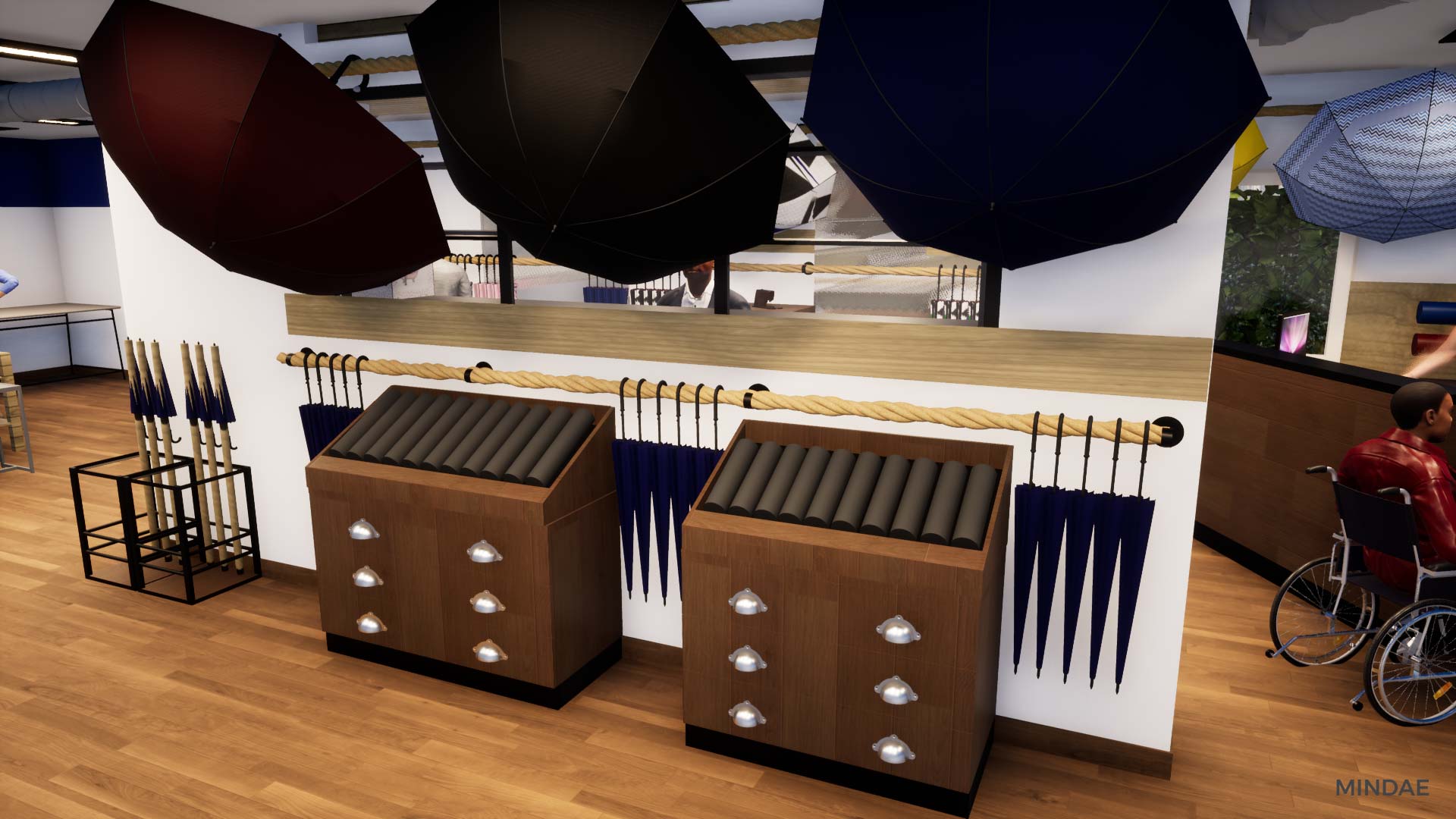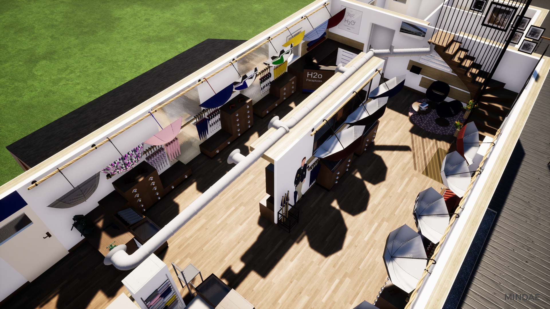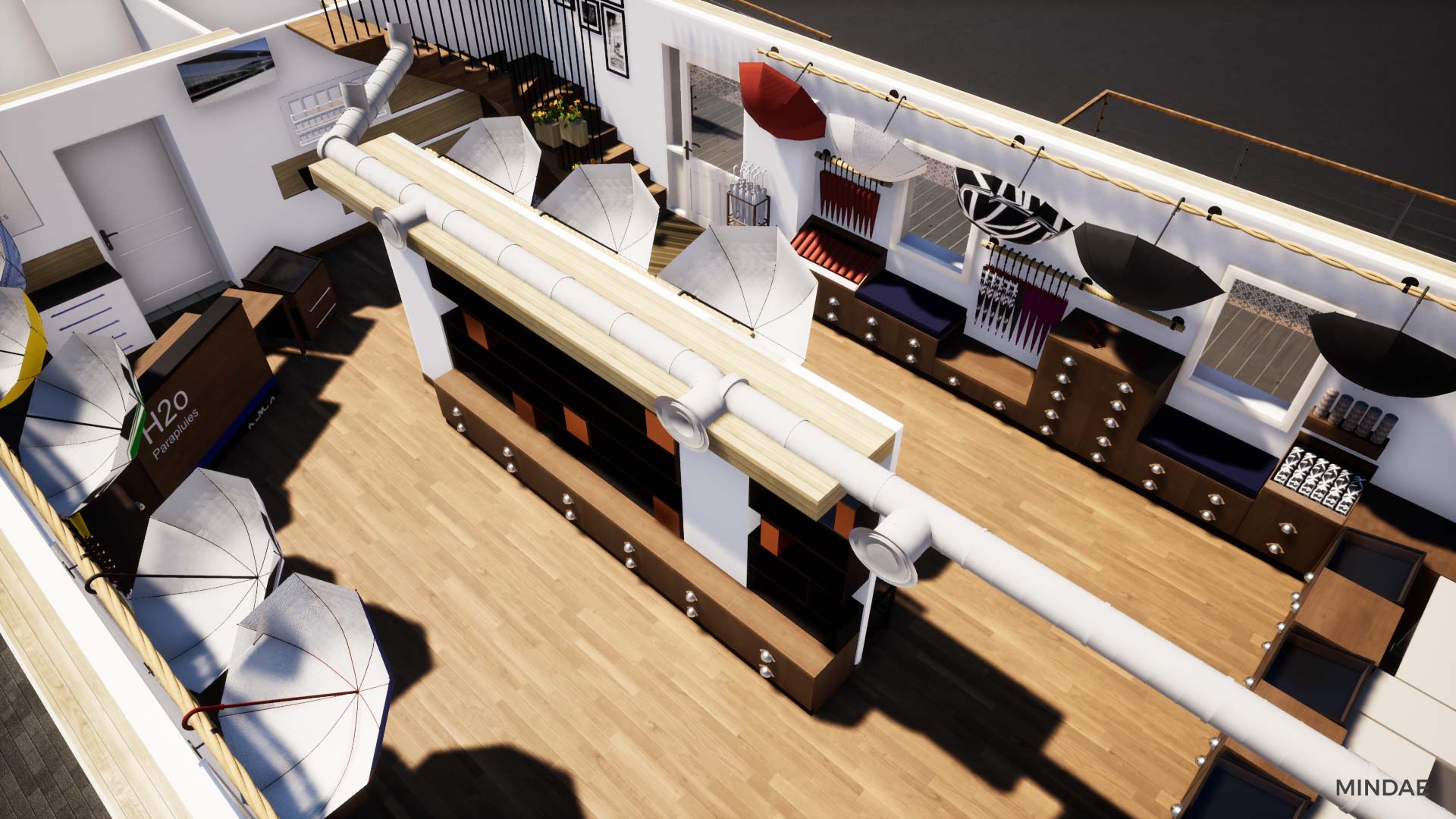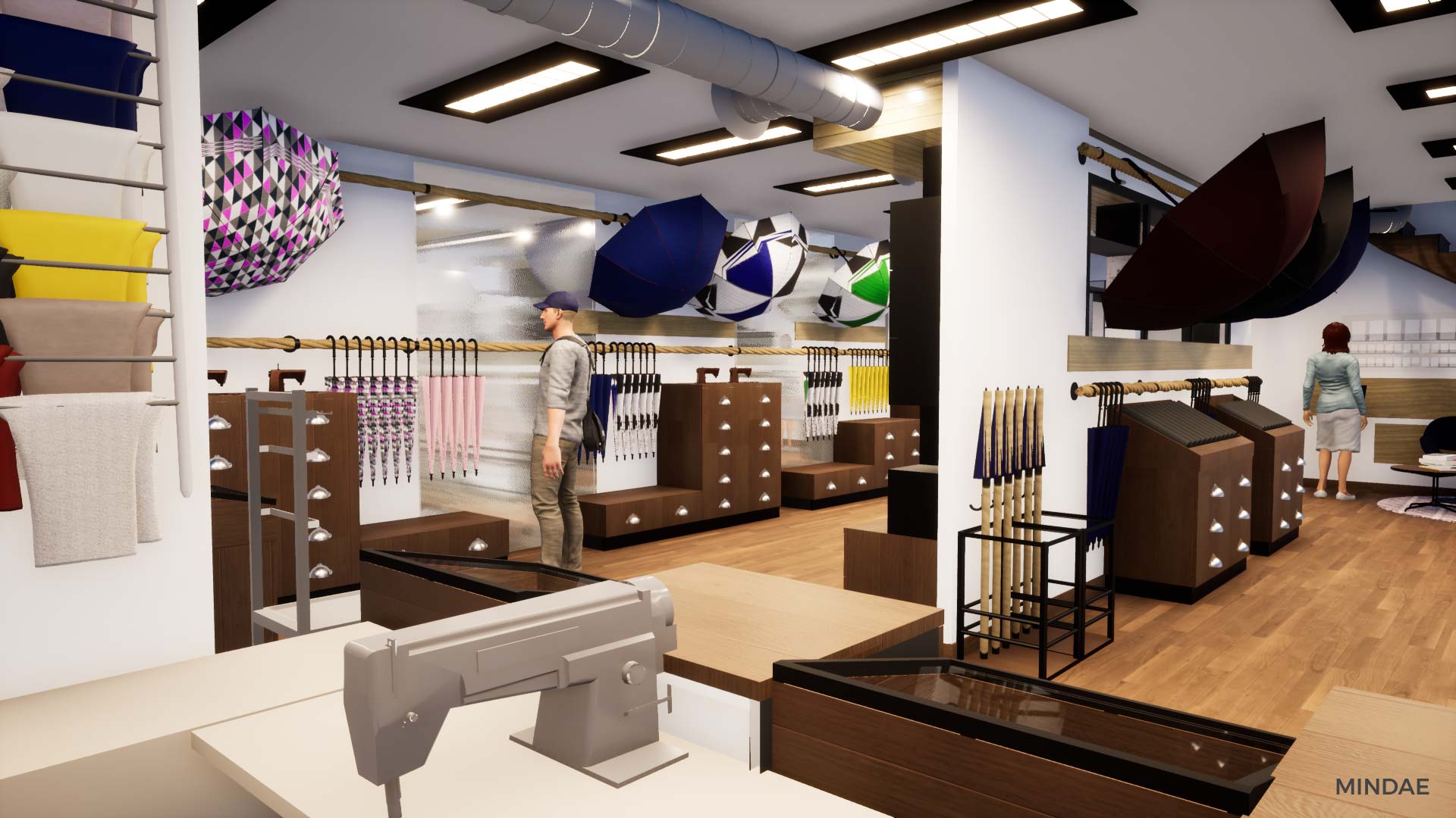 Design et agencement de l’atelier boutique H2o Parapluies à Crépon suite au rachat de la société. L’agencement intérieur a été revu afin d’agrandir la surface de vente et permettre l’exposition de produits de négoce made in France et made in Normandie. La boutique est maintenant séparée en deux parties : une partie exposition de produits avec de nombreux rangements. Une boutique moderne et inspirant la qualité, à l’image des parapluies. Et une partie atelier de confection à la vue des clients, agencée en fonction des différents aspects techniques de la fabrication d’un parapluie. Des visites sont possibles dans la boutique où vous pouvez admirer la fabrication étape par étape d’un parapluie. Chaque produit est personnalisable selon vos goûts et vos envies. Enfin, Mindae s’est aussi occupée de la conception du mobilier sur mesure : rangements, présentoirs, comptoir. La boutique est refaite en totalité.