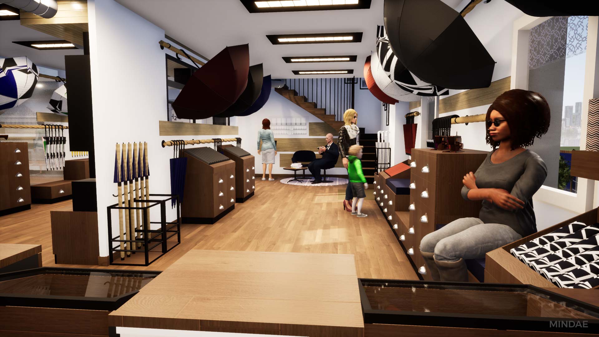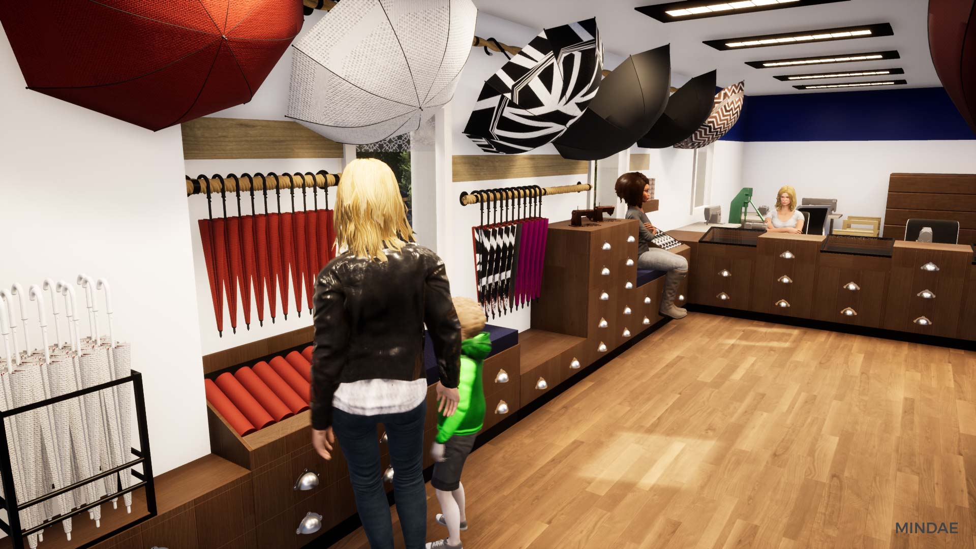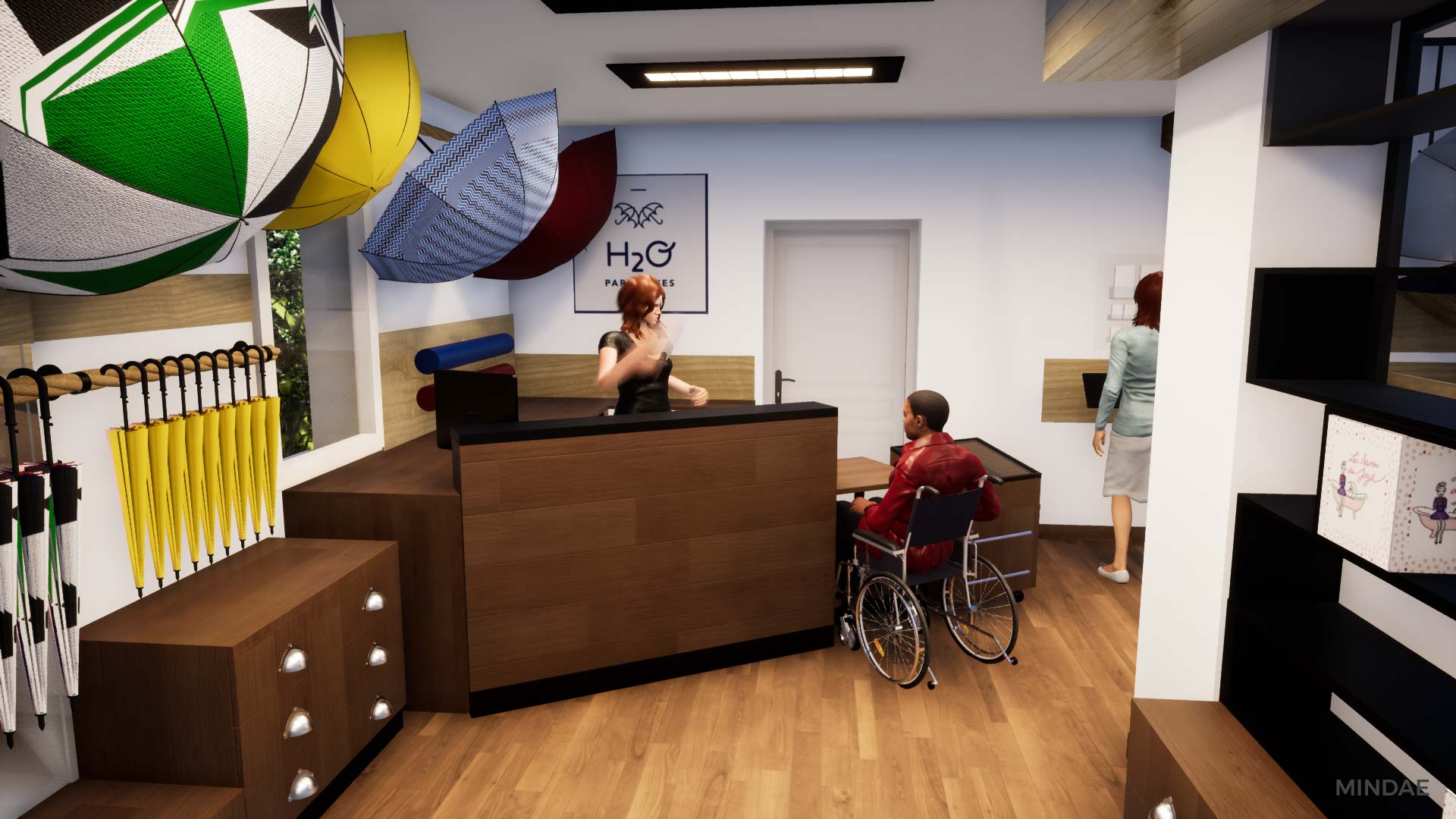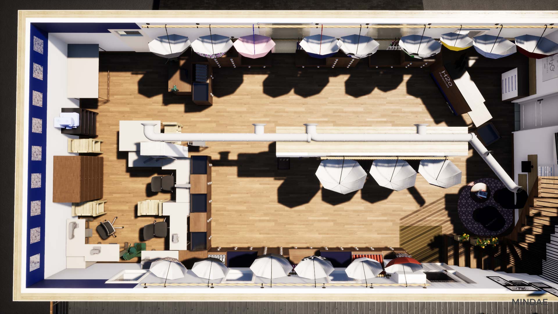 Design et agencement de l’atelier boutique H2o Parapluies à Crépon suite au rachat de la société. L’agencement intérieur a été revu afin d’agrandir la surface de vente et permettre l’exposition de produits de négoce made in France et made in Normandie. La boutique est maintenant séparée en deux parties : une partie exposition de produits avec de nombreux rangements. Une boutique moderne et inspirant la qualité, à l’image des parapluies. Et une partie atelier de confection à la vue des clients, agencée en fonction des différents aspects techniques de la fabrication d’un parapluie. Des visites sont possibles dans la boutique où vous pouvez admirer la fabrication étape par étape d’un parapluie. Chaque produit est personnalisable selon vos goûts et vos envies. Enfin, Mindae s’est aussi occupée de la conception du mobilier sur mesure : rangements, présentoirs, comptoir. La boutique est refaite en totalité.