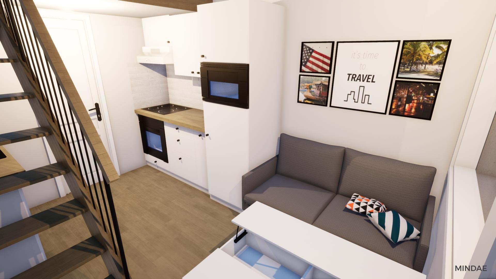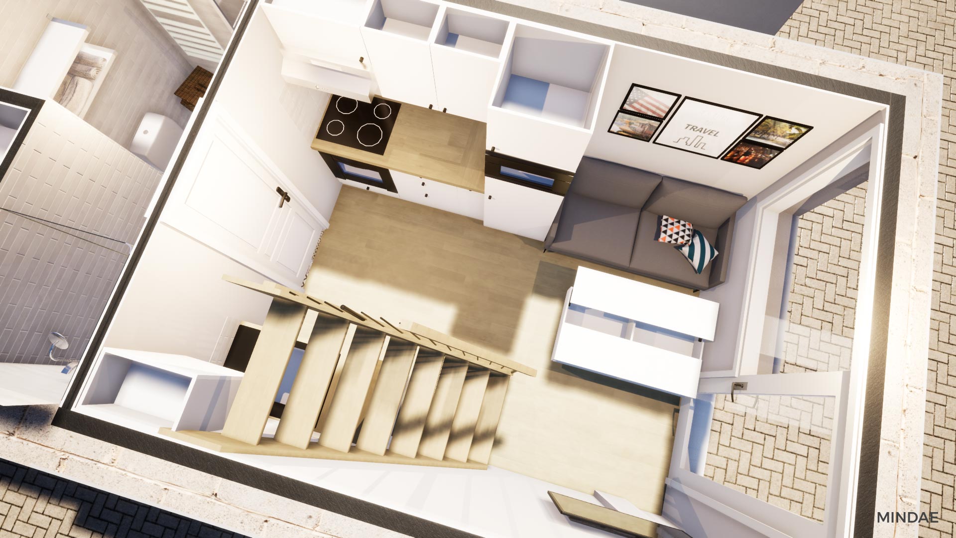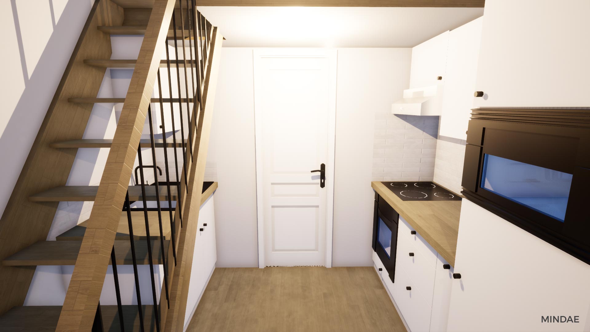 Voici le projet retenu : la hauteur de toiture a permis l’aménagement d’une mezzanine afin d’accueillir le couchage. Le rez-de-chaussée fut dédié à un salon avec cuisine ouverte ainsi qu’une salle de bains. Derrière l’appartement se situe un espace buanderie avec machine à laver commune pour le duplex et la maison mitoyenne. L’ancienne porte de garage fut transformée en baie vitrée. C’est également par là que se fait l’accès au duplex. Une fenêtre de toit est aussi rajoutée à l’étage pour gagner encore en lumière.