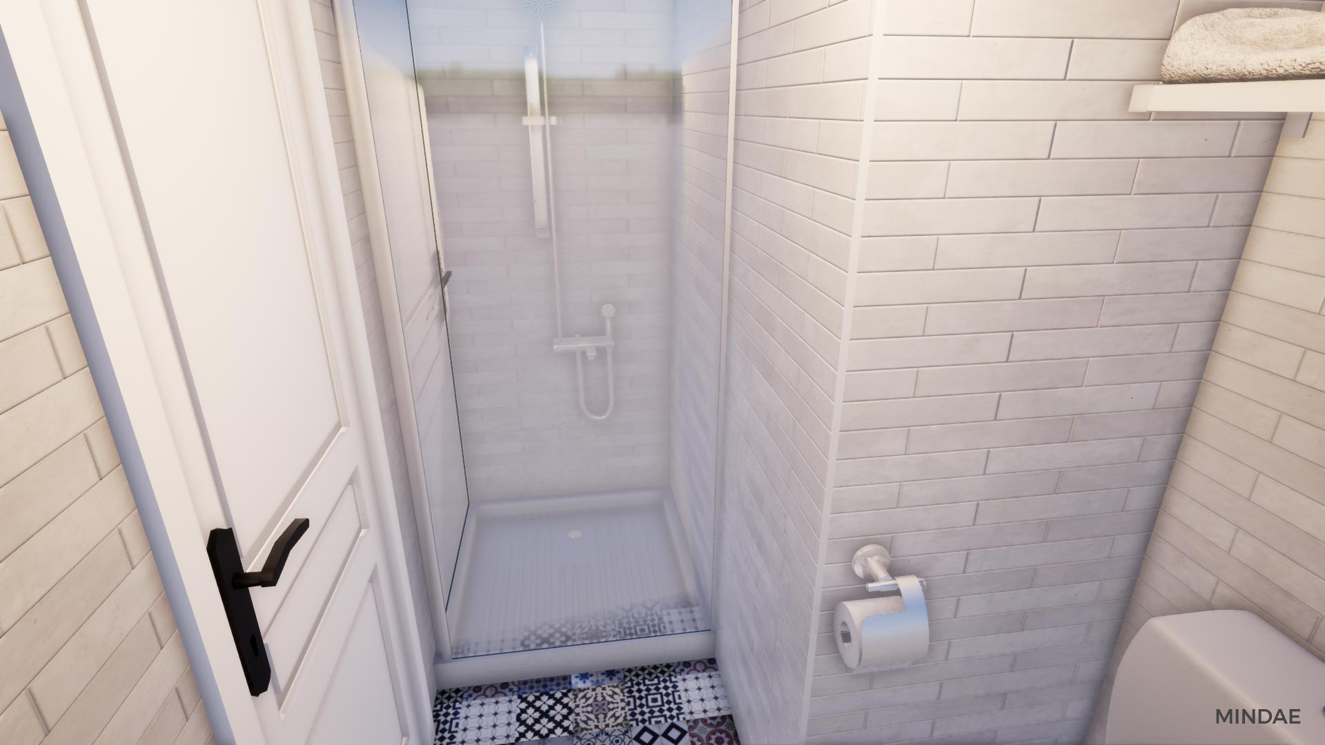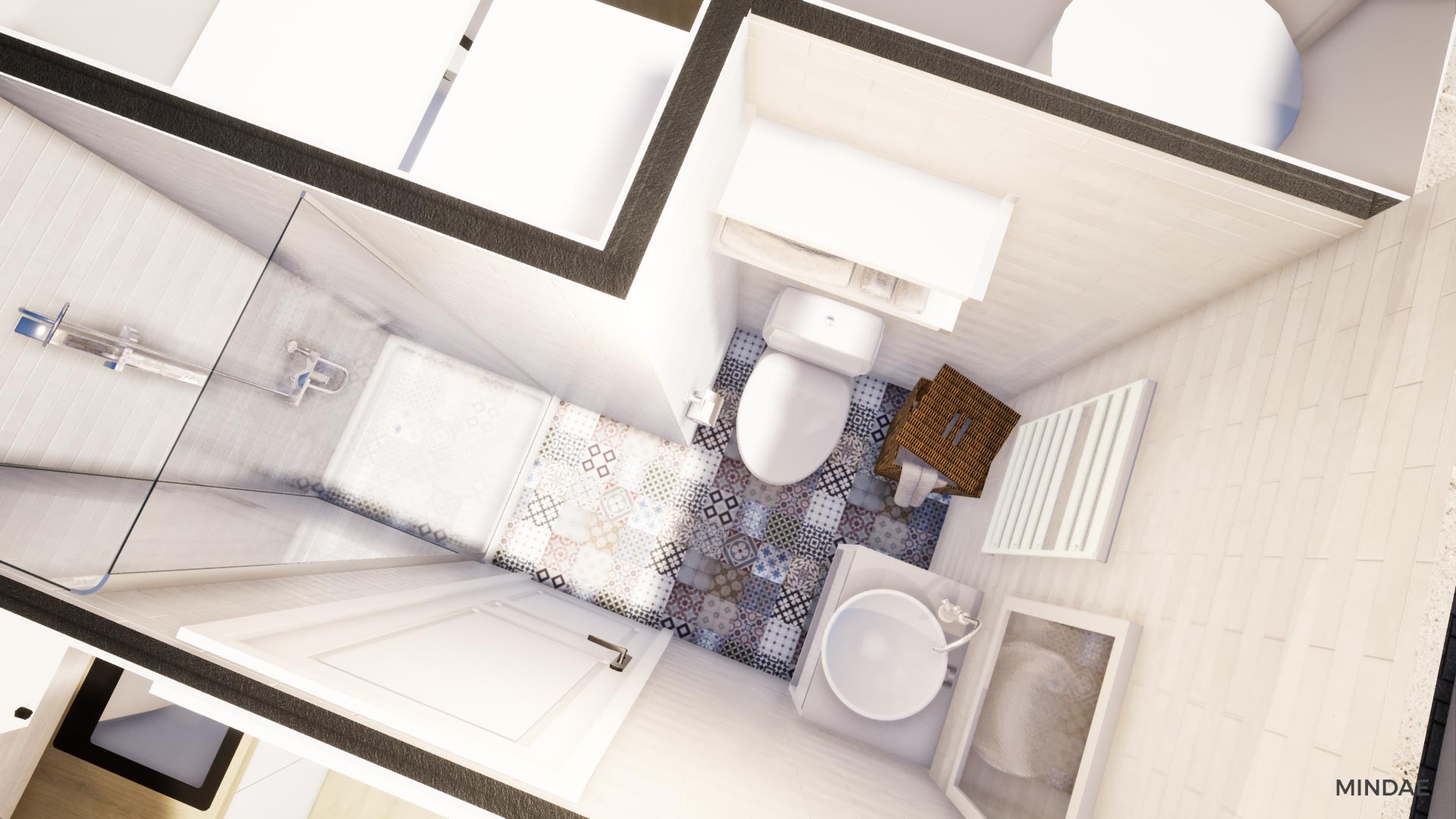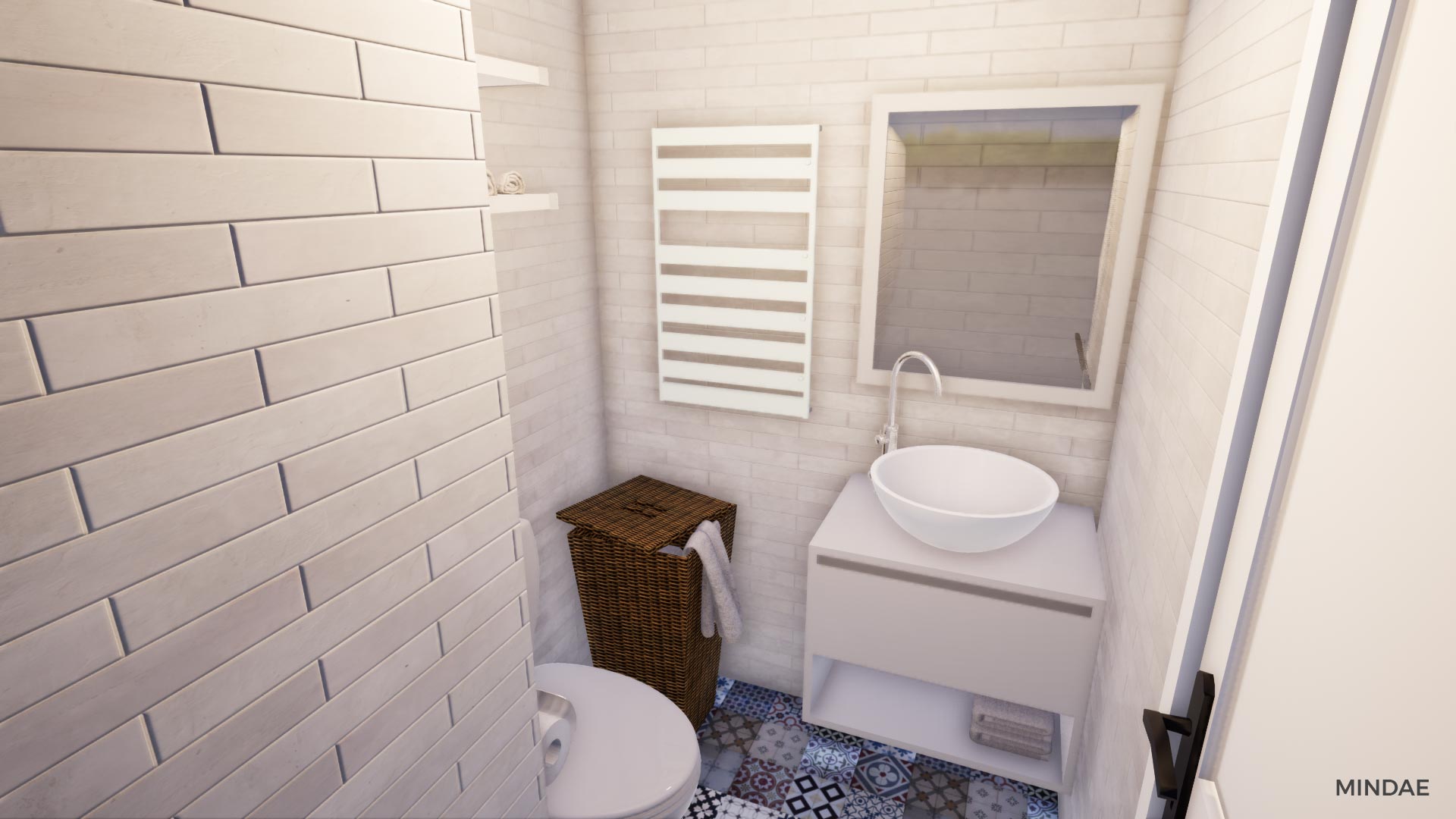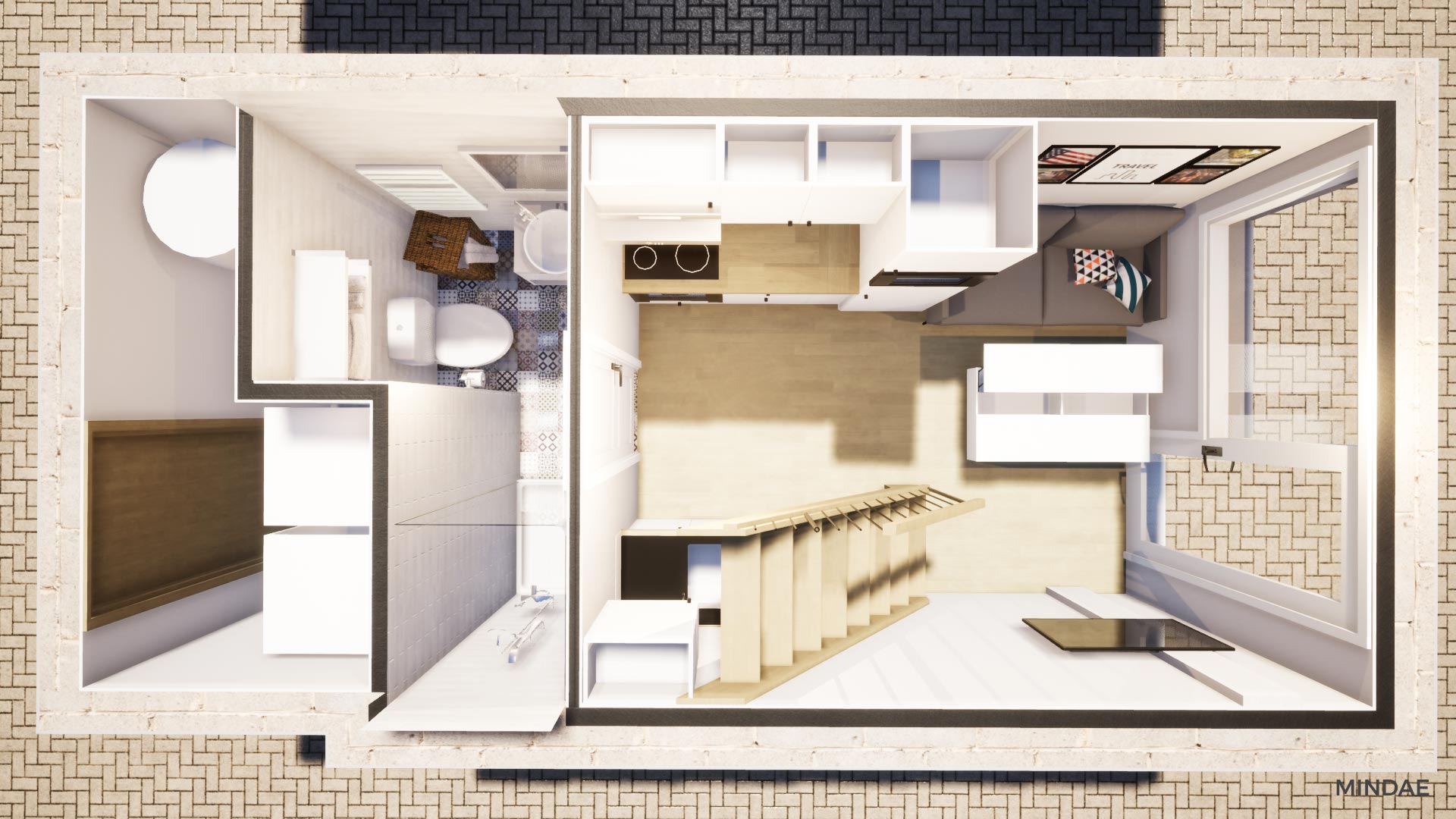 Voici le projet retenu : la hauteur de toiture a permis l’aménagement d’une mezzanine afin d’accueillir le couchage. Le rez-de-chaussée fut dédié à un salon avec cuisine ouverte ainsi qu’une salle de bains. Derrière l’appartement se situe un espace buanderie avec machine à laver commune pour le duplex et la maison mitoyenne. L’ancienne porte de garage fut transformée en baie vitrée. C’est également par là que se fait l’accès au duplex. Une fenêtre de toit est aussi rajoutée à l’étage pour gagner encore en lumière.